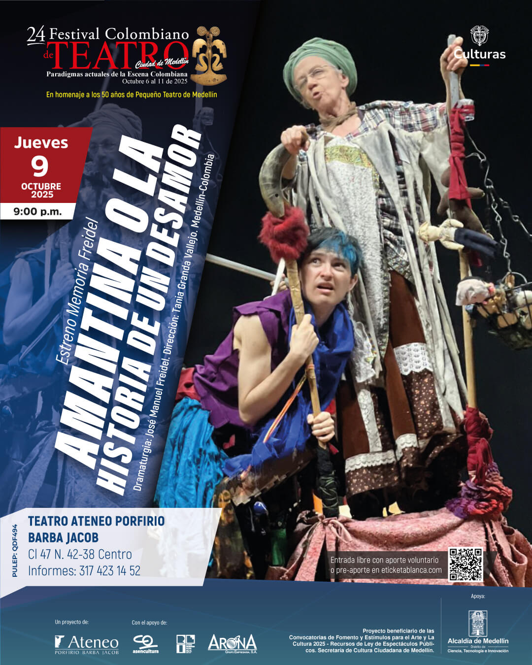 BOLETERÍA: Aporte voluntario en el teatro o https://tickets.eticketablanca.com/event/24-festival-colombiano-de-teatro-ciudad-de-medel-kjksuq?id=24-festival-colombiano-de-teatro-ciudad-de-medel-ipmwhe&eventId=6879d8b12af20c5b50722b08